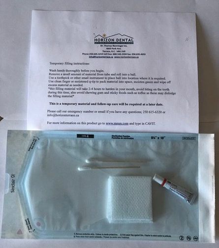 Since we are currently only able to offer treatment on an emergency and urgent basis, we have put together a self-care temporary tooth repair kit for our patients to use at home during the COVID-19 crisis. While not considered an emergency or urgent treatment, we realize that a broken tooth, broken or lost filling can be very uncomfortable. The material provided in these kits is only for temporary use and followup treatment will be required at a later date. To purchase a kit, please contact us at our emergent care number 250-615-6320 or email us at info@horizonterrace.ca to make arrangements.